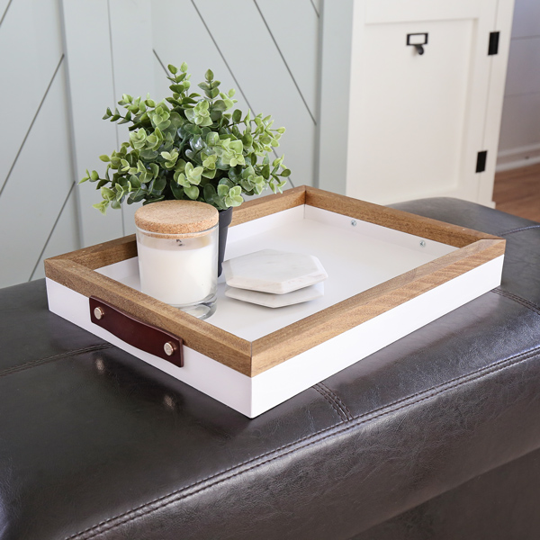 You can whip up this DIY wood serving tray in no time! All you need are three tools: a brad nailer, a drill, and a miter saw.