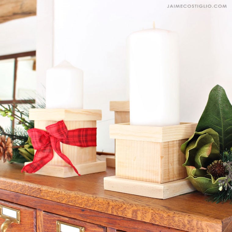 Turn your scrap wood into beautiful DIY pillar candle holders! They make amazing gifts and stunning holiday table decor. Get the step-by-step tutorial.